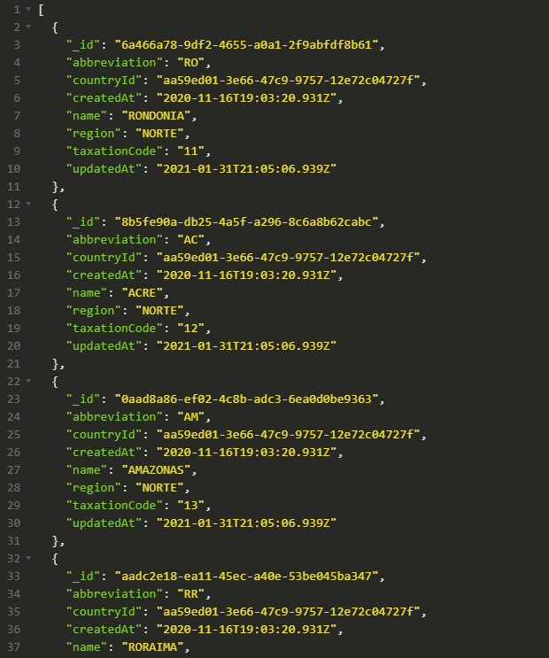 Se a requisição estiver correta, uma resposta do tipo 200 OK será retornada, juntamente com uma coleção de estados, classificados por país.