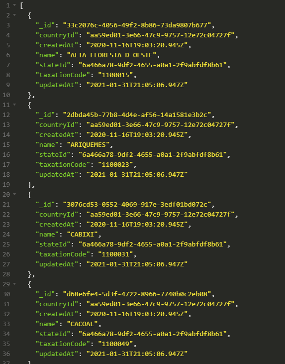 Se a requisição estiver correta, uma resposta do tipo 200 OK será retornada, juntamente com uma coleção de cidades, classificadas pelo estado.