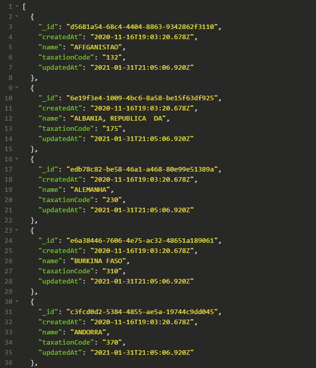 Se a requisição estiver correta, uma resposta do tipo 200 OK será retornada, juntamente com os dados de todos países suportados pela plataforma.